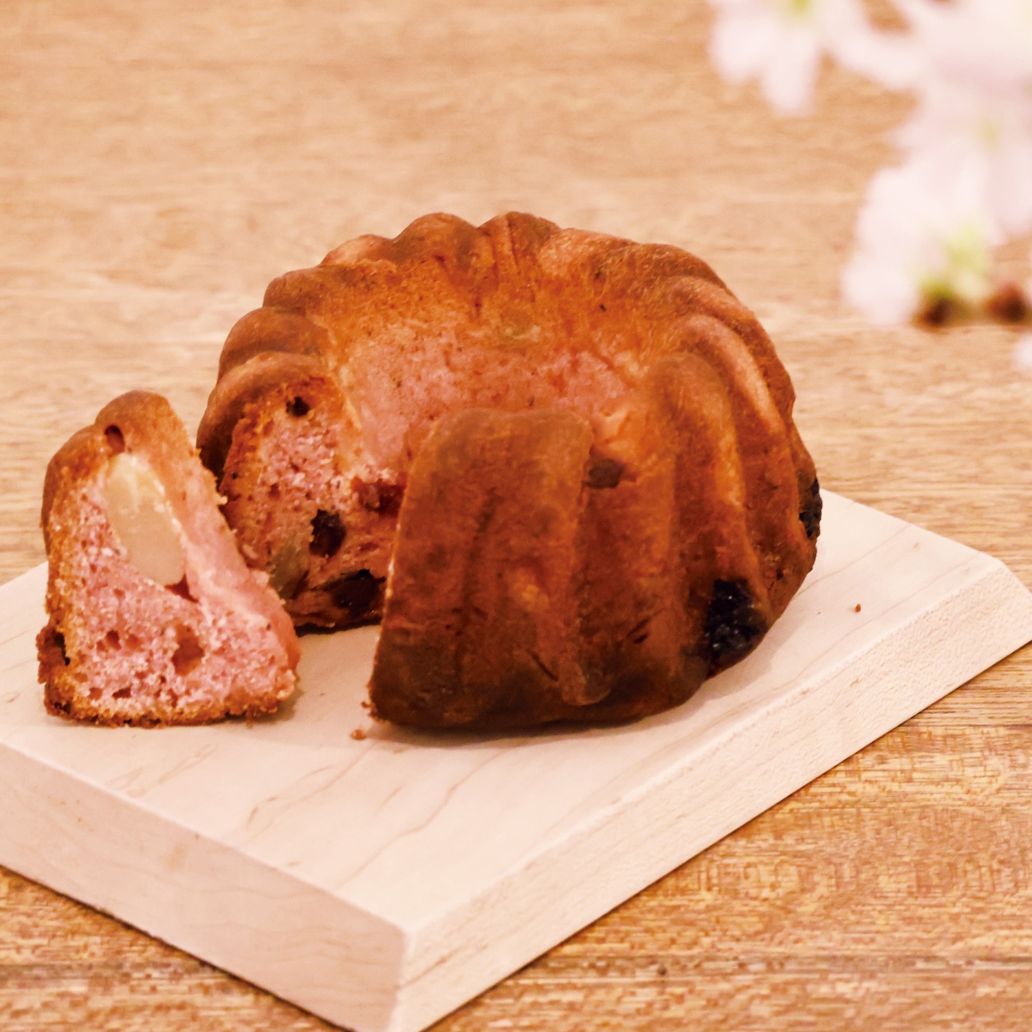 さくらの風味が香る生地に白ワイン漬けのいちごやクランベリーと優しい甘さの「白花豆」を入れて焼き上げた春限定のクグロフです。